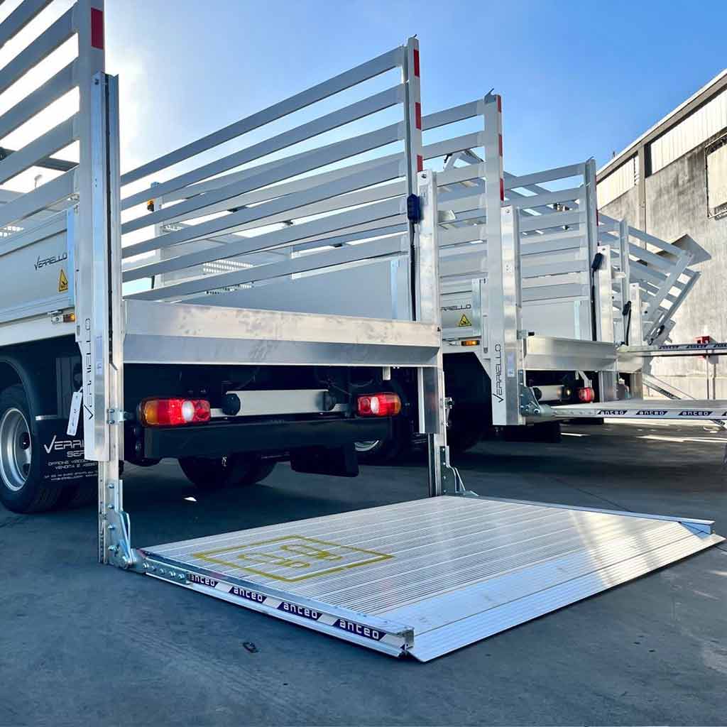 This full alluminum frame column lift has been designed for utility and light commercial vehicles with flatbed or dropsided bodywork. With a lifting capacity of 500 kgs, the lift with folded platform provides a facility to load the rear of the vehicle over the lowered platform without having to unfold the platform, reducing the possibility of damaging the platform. It also has a much reduced drag effect on dropsided vehicles when travelling, due to the folded platform, and gives the vehicle better fuel economy than with a full depth platform.